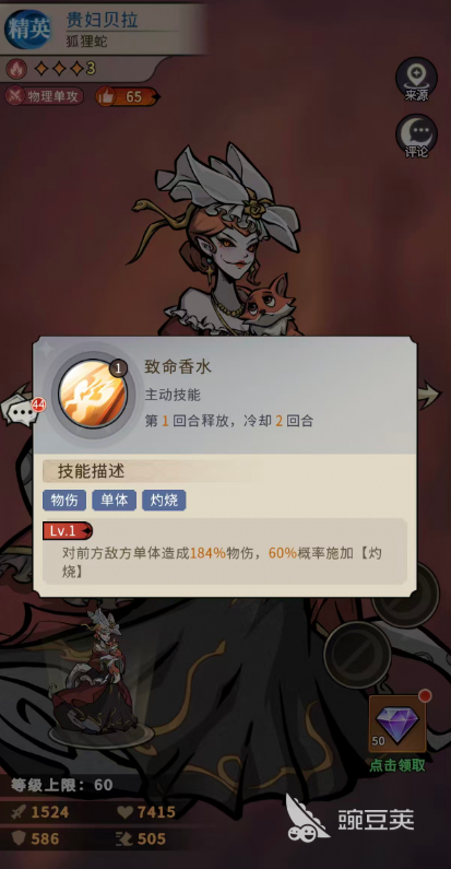 如果是新手用贵妇贝拉的话,她是非常适合玩物理队的,毕竟前期面对的敌人类型也没有那么多,所以贵妇贝拉带来的单攻在新手前面的机关基本也够用,在技能效果上面她唯二的两个技能当中,第一个致命香水作为主动技能会比增益技能好用一些,这个技能作为物理伤害的主要技能,带来的单体灼烧在大家没有其他更多可以施加灼烧角色的时候是不适用的,要是走灼烧队的话,其实在这里前期也可以上贵妇贝拉,因为她拥有的这个灼烧效果是当前火系元素里面独有的能力,所以走灼烧队的时候,大家是有机会可以用上的,贵妇贝拉用这个技能可以对前方敌方单体造成184%的物伤,然后是有60%的概率施加灼烧状态,相比基础的伤害数值而言,这个施加灼烧的概率还是挺大的。