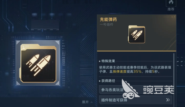 充能弹药是前期玩家装备最多的插件,也是金色品质的插件,对于大部分武器来说都能够兼容使用,能在作战中缩短换弹的时间,命中敌人的弱点后,还能为武器技能充能提升速度,通过推动主线任务或者日常挑战,都有机会获取充能弹药插件,扩容插件也是适配大多数武器的,装备之后弹夹上限会提升,战斗中命中敌人弱点后,还能自动装填一发子弹到弹匣内,增加武器的续航能力,在作战时还能提升枪械的充能速度,在插件制造的玩法中能获取材料自行制造。