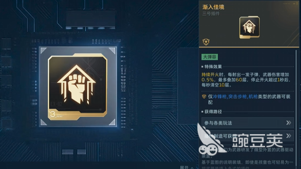 假如使用的是冲锋枪或者突击步枪,那最适合搭配的就是渐入佳境插件,在射击过程中会根据射击速度逐渐提升伤害,对于中短距离的武器适配性非常高,每次攻击后还会叠加一层效果,最多叠加到60层,通过渐入佳境插件能持续增强战斗力,作为基础插件,在前期获取也非常简单,通过在完成赛季任务就可以获得插件的奖励,后期任务的完成度越高,这些插件的品质越高,能给玩家带来更强的帮助。