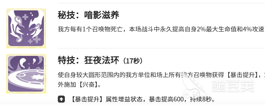 狂夜法环这是一个特殊技能,具有群体增益的效果,有600点的暴击提升,可以让我方的输出效率得到满足。同时也是旷野之灵阵容的核心联动点,从天赋到神格,从绝技到特技,角色的每一个技能全部都是围绕团队,还有召唤物,可以让召唤物成为战斗力,也可以给队友带来更好的生存保障。在战场上这个角色始终就是战术的核心,具有运筹帷幄的优势,在故事里面是一个追光者,一直都在履行自己的契约。