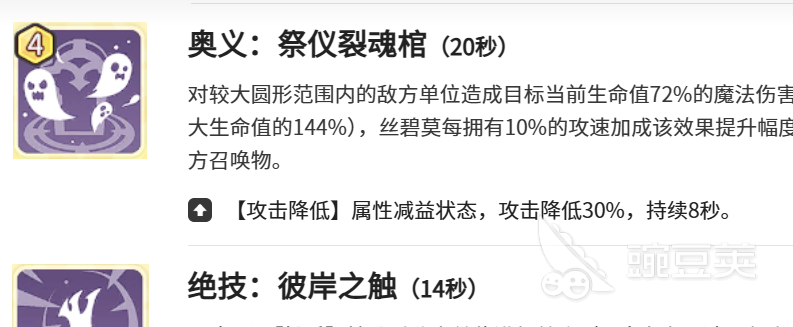 彼岸之触这就是一个绝技,又被称之为团队的关键保障。有14秒冷却召唤的触手,就可以继承角色80%的攻击,还有100%的攻击速度。持续15秒的普攻不仅可以造成魔法伤害,还可以给血量较低的队友回复4.1%的最大生命值。更巧妙的就是遗言机制,队友被击败时积累的层数全部都会转换成目标的增益,让牺牲就成为了团队翻倍的伏笔。暗影滋养是秘密技能,可以给持续性作战带来更多的保障,最多30层的永久生命,还有攻击力加成,就可以越战越强。