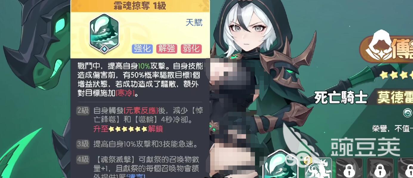 玩家在合理的运用死亡骑士的时候,由于它也具备增伤的机制,通常情况下,在战斗的过程当中,一旦攻击没有增益状态的敌人的时候,自身的伤害将会大幅度的提升。另外,他其实跟彼岸队的核心机制是非常融合的,通常在战斗刚开始的时候,他需要有效地提高自身的攻击,这样才能够造成伤害,并且它还具备一定的概率,能够驱散敌人的增益状态。当他成功的施展驱散之后,会额外施加寒冷,并且能够达到清除敌人的作用。在这里主打的就是能够清除敌人的护盾,此时他将会施展一技能,这时候就能够获得遗言的层数。
