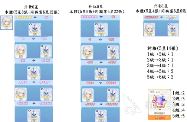 要想完成星级的突破,升星紫色6星,那就需要5星本体8个,还有同职业6星12个。这一个阶段主要就是角色基础性的强化,在收集素材时是比较容易的,建议优先把主力角色提升到一级。升级红色6星难度相对比较高,需要五星本体6张,还有同职业6星22张,突破之后角色的技能就会大幅度的提升,这也是中期战斗力的主要保障。升级彩色就等同于质变的关键,除了五星本体4张之外,还需要同职业6星6张,另外还需要五星神格14章,同时神格升级也有明确的要求。