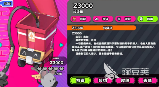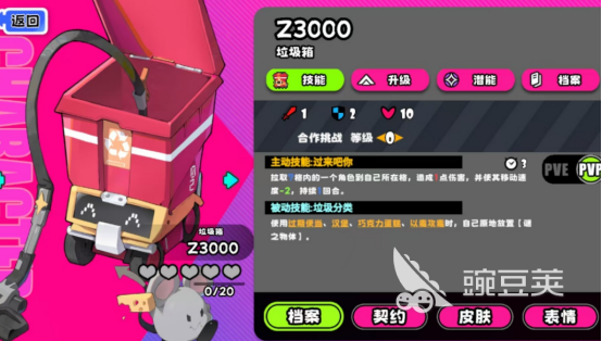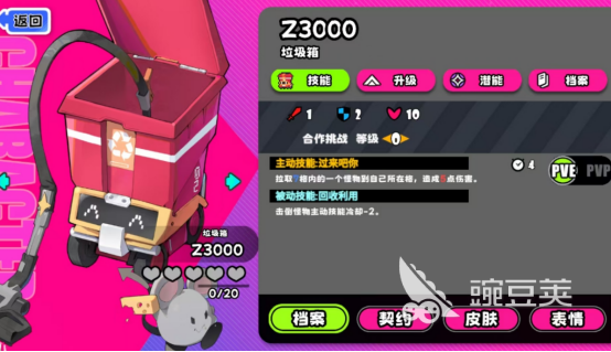 垃圾箱的操作性相对来说比较强,可以极大程度上掌控整个战场的局势,因为身上拥有主动技能以及被动技能等等,首先就需要针对于主动技能进行全面解析。在不同的战场环境当中,可以快速将七格范围之内的敌方单位强制拉回到自己的身边,而且也会对其造成较大的伤害值,这也是垃圾箱的战术基础。其次在pvp模式中,主动技能也会对敌方造成2.2伤害,还可将移动的速度直接减2.这种状态将会持续二回合,也可在战场上为队友创造更多的输出机会,其次在合作模式上,对于怪物也会造成5点的高额伤害值,还会附带一些减速的效果,在整个团队中也是非常重要的输出点。