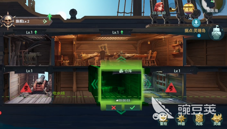 除了战斗玩法游戏还有提供建造、贸易以及各种探索玩法,这些玩法里面也是可以拿到更多启动资源的,包括基础的船员,大家拿到之后可以安放在船只里面进行海外探险,在这里核心玩法当中船舱建设是一定要注意的重点,因为在船舱当中所有的东西都是要大家用作海上发展的,而且优先升级的话,也可以让大家建造的船舱效果更高级一些,那么在这里船舱里面不同的场景,提供的能力是不一样的,比如说船长室,如果大家觉得自己的指挥能力比较低的话,优先选择船长室来进行建造,这样的话,在前期就可以提升不同角色的指挥能力,提升到战舰的整体属性效果,之后会让这个船舱的能力更强势。