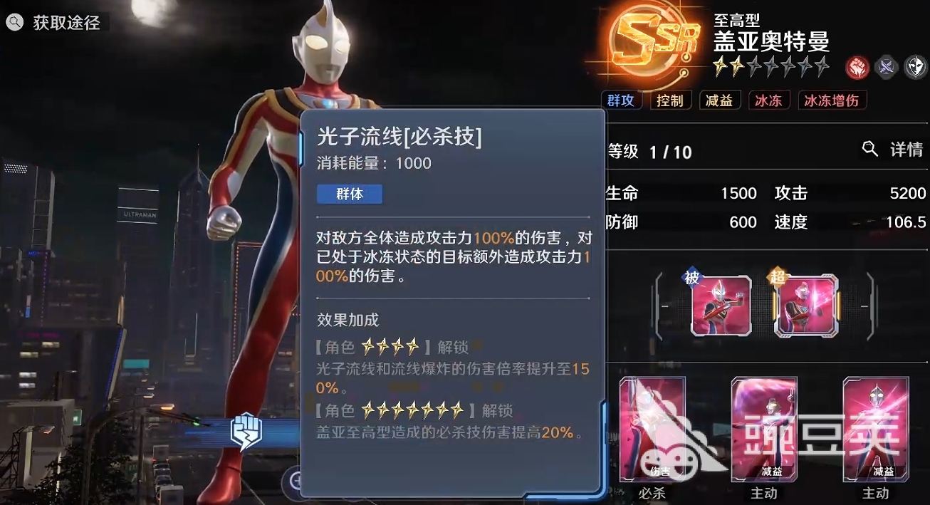 闪耀迪迦在释放必杀技时,可让自己化身为持续一回合的光之战士,并能对敌方全体造成伤害,还可根据自身的护盾值再造成一段额外伤害。虽说这段基于护盾值的额外伤害不能超过闪耀迪迦攻击力的100%,但可以提供护盾的角色很多,很轻松就能超过上限,实战里能打出爆炸输出。