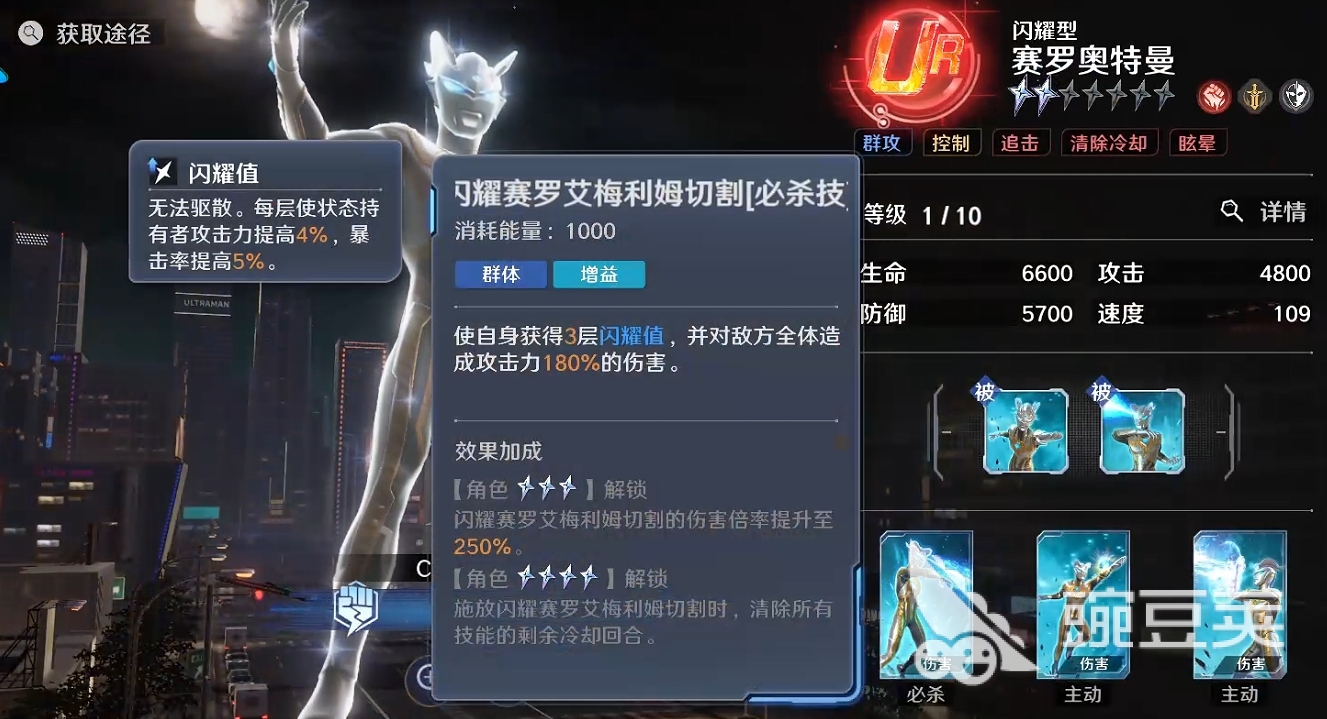 闪耀赛罗的必杀技是既能给到自己增益,又能造成伤害的技能,释放时会首先为自己叠加三层的闪耀值,每层会增加他4%的攻击和5%的暴击,随后便会对敌方全体造成倍率超高的伤害。并且这三层的闪耀值会在必杀释放技能后继续存在,此时若闪耀赛罗触发了反击,也能享受加成。