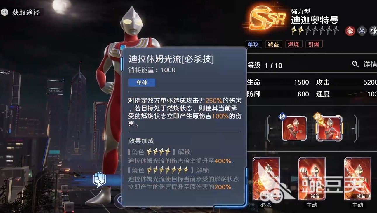 有着引爆燃烧效果的必杀技是强力迪迦的看家本领,它有着极高的单体爆发,初始就能对目标敌人造成250%的伤害,若是目标敌人身上存在着燃烧效果,必杀技还会直接将燃烧效果引爆。所以人们在使用强力迪迦的必杀技时,最好为他选择正受燃烧影响的敌人。
