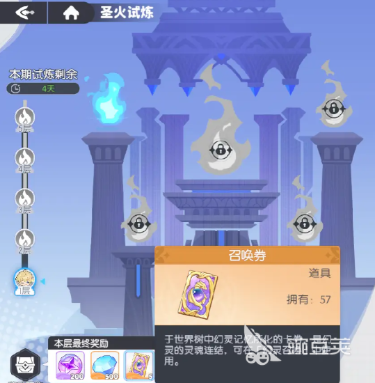圣火试炼比较有良心的地方就在于很公平,所有的幻灵等级装备都是统一的。职业命途还有图鉴这些额外养成系统并不会生效,会拒绝战斗力碾压的情况。巨龙这边只看星级,还有龙巢,主角品德带来的加成不算数,因此所有人的起点都是一致的。玩法结构很清晰,总共是5层,每一层又会分成5个进度。每打通一个进度就可以获得钻石,通关整层之后,还能获得钻石奖励,还有金币奖励。尤其是第5层通关之后,还可以拿到神话召唤券,这还是比较核心的。赛季周期大概是8天,时间很充裕,并不需要着急去赶进度。