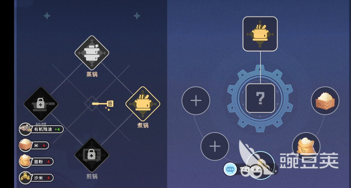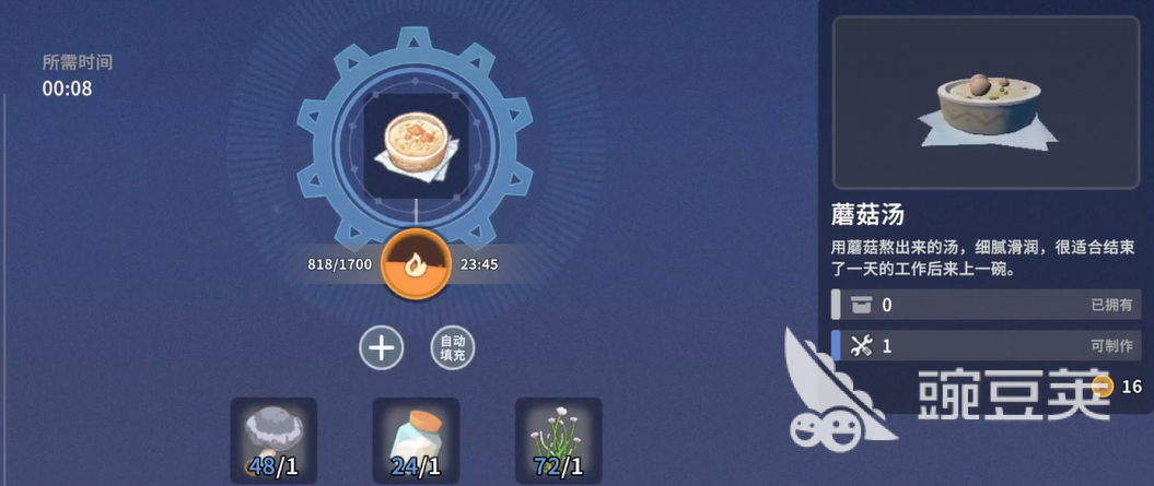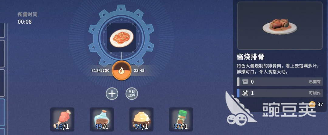 先说几个比较基础的食谱配方。蜜汁油果这道菜需要准备蚁蜜和爆浆油果这两样材料就行,做法算是比较简单的。排骨焖饭相对复杂一点,需要排骨、米还有爆浆油果三种食材才能完成。这道菜回复的体力值还不错,很适合干重活之前吃一份。