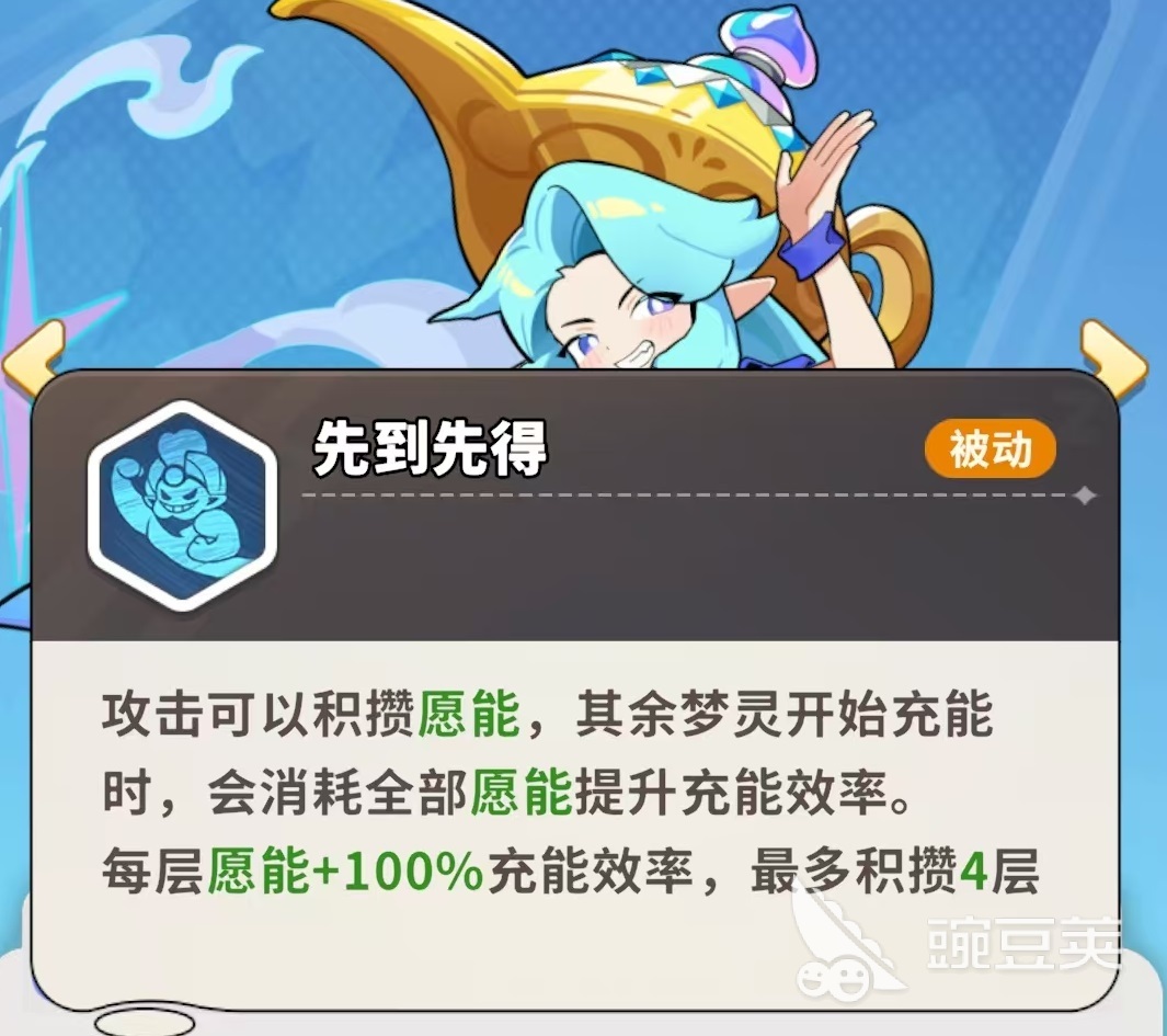 主动技能“灯灵出击”可释放迷雾,对范围内敌人造成多段范围伤害;被动“先到先得”则构建其辅助枢纽作用:每次普攻积攒1层愿能(上限4层),当其他梦灵启动充能时,将自动消耗神灯王子当前全部愿能,每层提供100%充能效率加成,满层即达400%加速,显著压缩技能循环周期。