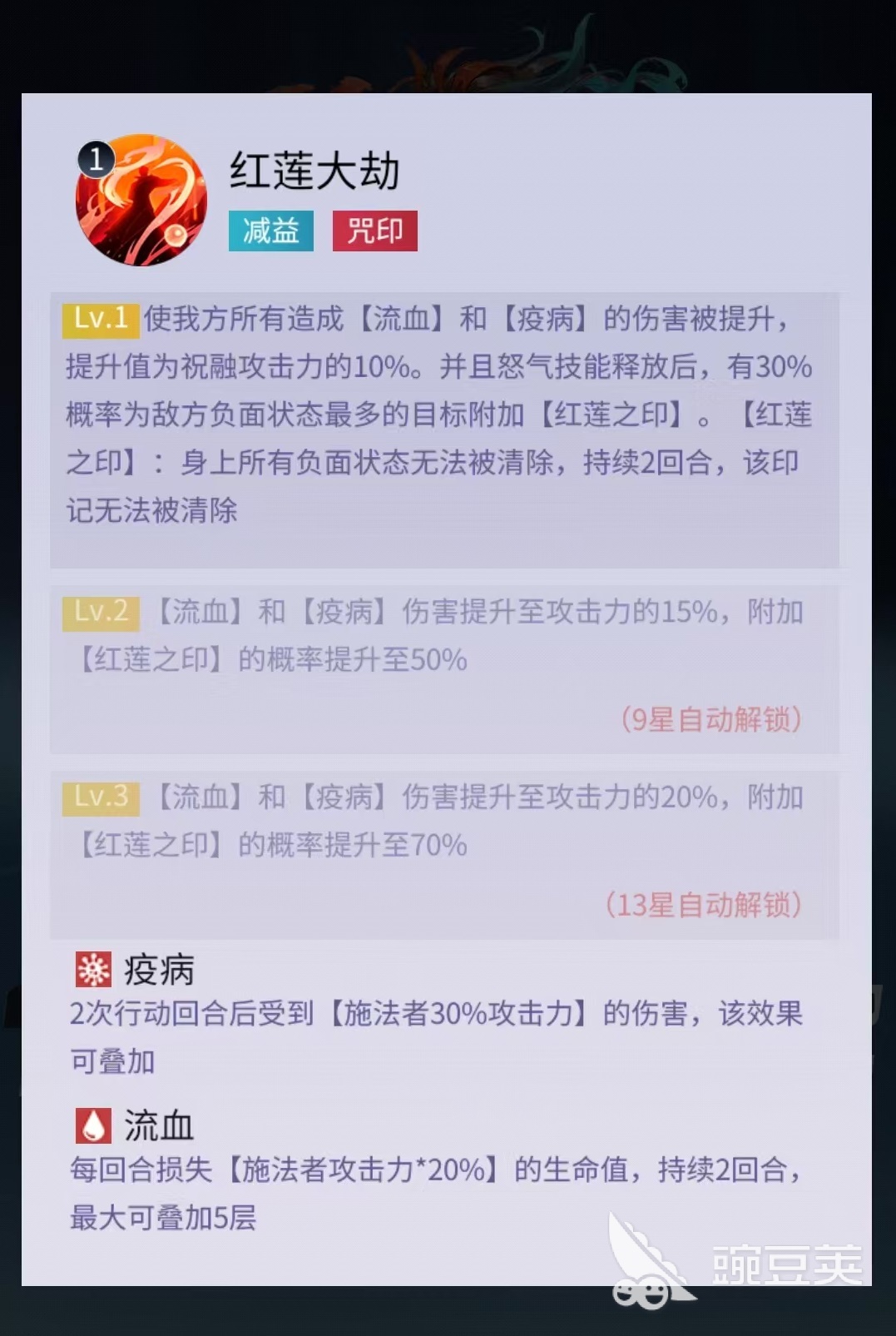 大招【红莲大劫】为团队赋能型核心技:释放后,全队造成的流血与疫病伤害提升,增幅量恒定为祝融自身攻击力的10%。更关键的是,怒气技命中时有概率为目标施加【红莲之印】——该印记强制锁定敌方负面状态最多单位,使其所有已存在异常状态及新施加状态均无法被任何形式清除(含范围驱散、单体净化等主流解控手段),彻底瓦解对手反制体系。