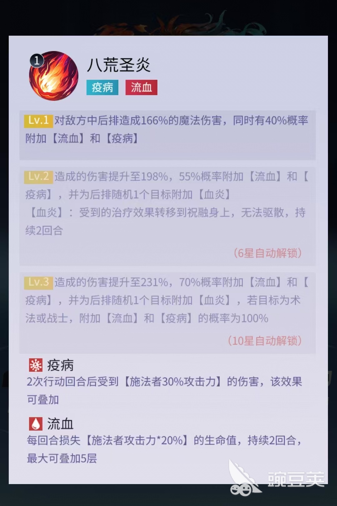 祝融的一技能【八荒圣炎】为核心输出手段,可对敌方中后排目标施加高额魔法伤害,并附带双重异常状态:流血(每回合固定数值真实伤害,最高叠加5层)与疫病(连续两个行动回合内额外承伤)。二者均属不可驱散类持续伤害,叠加生效后具备极强的压制力与斩杀潜力。该技能随等级提升,异常状态触发概率同步增强;此外,升级后还可随机为一名敌方后排附加【血炎】效果——若目标职业为法师或战士,则其流血与疫病致死率将直接提升至100%,形成高确定性终结链。