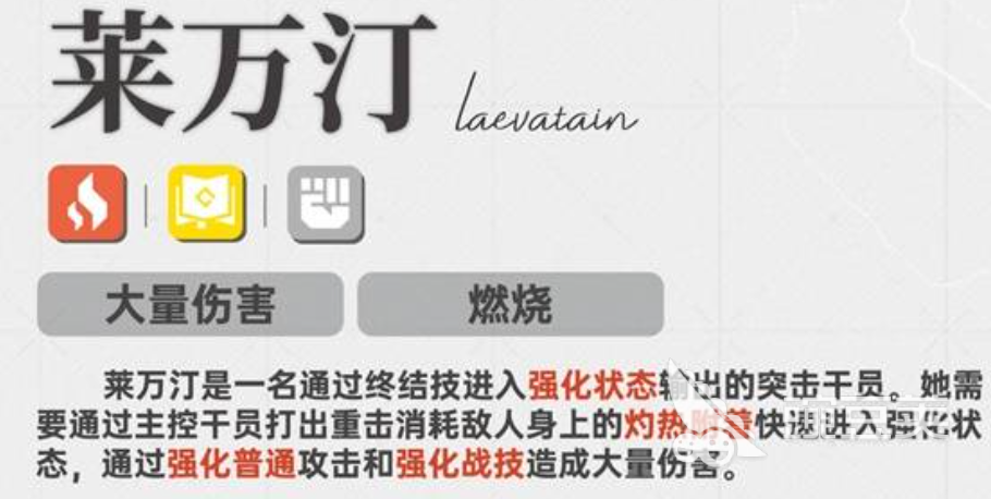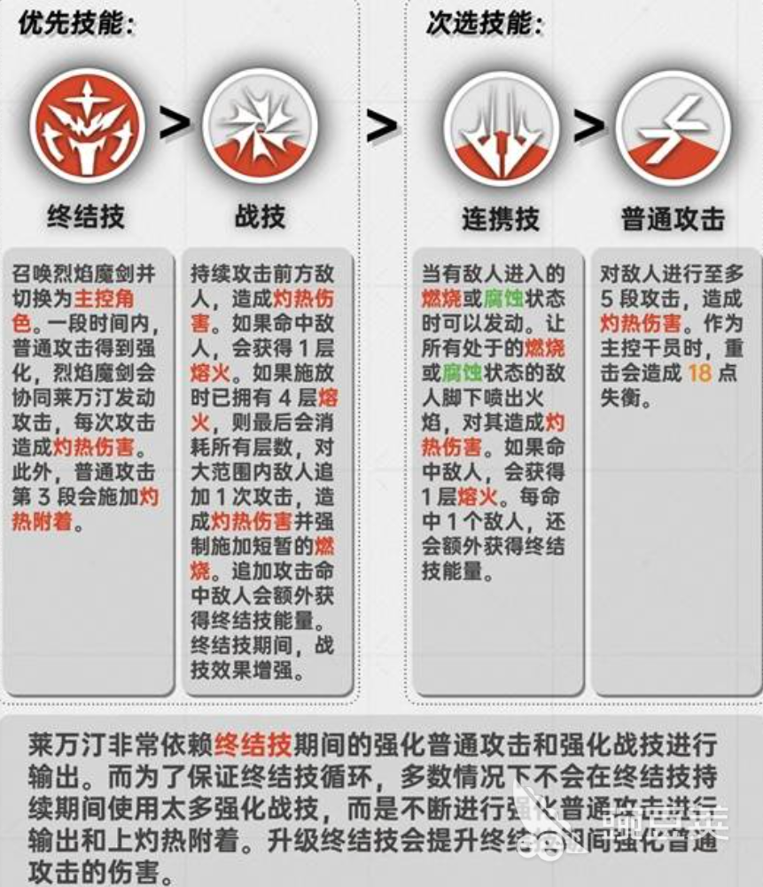 玩家想要培养莱万汀的时候,先要了解他的机制,比如他凭借灼热的伤害作为基础条件。在战斗的过程当中,围绕熔火层数来进行展开,一旦在战斗的过程当中,借助重击能够有效地吸收敌人身上的灼热附着叠加的层数,一旦消耗层数释放的战斗技能,能够有效的解锁额外的伤害。其实他在施展战斗技能跟连携技能的时候,能够有效地加速终结技能的快速回能。而他的终结技能作为爆发的核心所在,一旦开启之后将会有效地强化普通攻击,并且还能够形成大范围内的斩杀。