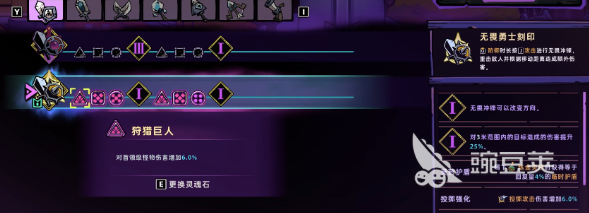 喜欢主动攻击的朋友可以关注无畏勇士刻印。防御状态下按一下攻击就可以发动无畏冲锋,在重击敌人的同时,还可以根据移动的距离去附加额外的伤害。一急时冲锋过程就能灵活地改变方向,针对三米范围内的目标都可以造成25%的伤害提升。同时还会拥有狩猎巨人的效果,针对首领级的怪物就会有额外6%的增伤。喝下炼金灵药之后,还能获得灵药回复量大概4%的临时护盾,可以有效提升续航的能力。搭配投掷强化的效果,投掷攻击伤害就可以增加6.0%。
