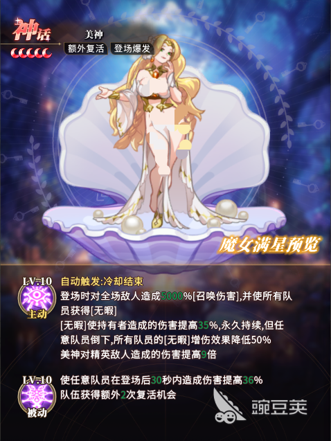 美神在游戏内的角色定位和技能特色方面有着不可磨灭的效果,她拥有的主动技能。在登场的时候能够制造出整场召唤性的损伤,并且还寄予队友无瑕的状态,具有持续永久的提高损伤的能力,在对战的过程中,如果队友被击倒,增伤效果可能就会降低至50%,玩家在搭配阵容的时候要注意这一特别点,选配合适的角色和她相搭,他还具有被动的输出技能,不管是哪个队伍进行输出攻击,美神都能够连续的为全队提高损伤,并且还可以提供另外的复活次数,使队友再次复活继续输出,他的这一特技能够使全体队员长时间的进攻敌方。