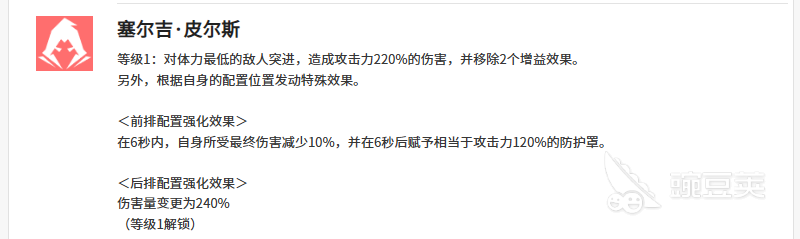 米里昂的第二个技能叫做塞尔吉皮尔斯,使用这个技能攻击的时候,她会选择一个体力最低的敌人,达到输出动作之后造成的伤害达到220%,此时还可以移除掉敌人身上两个增益能力,另外根据他自身的位置,发动这个技能的时候,如果是在前排,那么在6秒时间之内,米里昂会受到最终伤害减少10%的影响,但是在施加成功之后,他会根据这个能力附加自己攻击力上面120%的防御护盾,如果是米里昂站在后排的话,根据这里的强化效果就会让自己的伤害量提升到20%,所以根据站位来确定这里米里昂的提升能力,还是比较具有灵活性的。