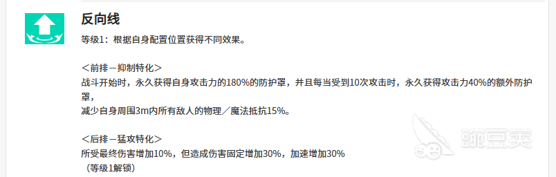另外米里昂的被动效果当中还有反向线的技能,这个技能就可以根据她当前的站位来获取多重能力,如果在前排站位,她在战斗一开始的时候自身会获取更多攻击力,上面有180%的护盾防御,然后受到了10次攻击的话,累积起来就会获取攻击力上面40%的额外防护,减少自身3m内敌人的物理以及魔法类型的抵抗效果,如果米里昂是在后排的话,得到了一个特化能力是体现在猛攻效果上面,也就是说米里昂受到的这种伤害后,在增加了10%数值之后,自己造成伤害时候固定会增加30%的数值,而且在自己释放技能的速度上面同样也增加30%。