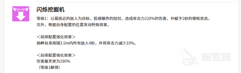 而米里昂的辅助技能可以使用的是闪烁挖掘机,这个技能目前根据最靠近她的敌人来输出,可以投掷出来爆炸的技能效果,造成200%的攻击之后,还可以同样给敌人带来2秒的眩晕,虽然时间持续的比较短,但是目前根据米里昂自身的定位同样是有特殊能力可以进行触发,此时的她站前排,那么会根据自身站位百分比带来攻击力减少10%的能力,但是此时周围3.5m之内所有的敌人都会受到她的这个影响,如果米里昂要是站在后排的话,那么这里达到了伤害量提升,就会强化到280%的数值。