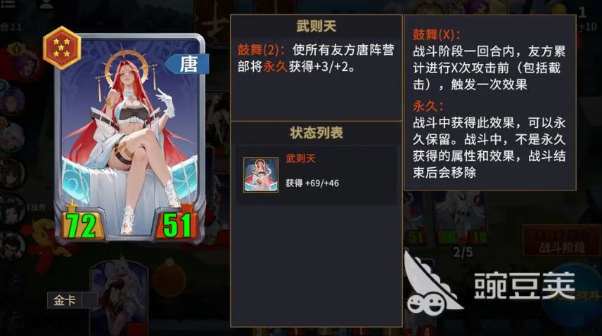 武则天当前作为前中期非常适用于过渡期使用的角色,后期如果达到六星的话,其实成型速度也是比较快的,因为她在建立各种启动机制的时候,达成的体系是比较强势,一旦入手成功,武则天在这里可以通过其余的组件获取更高的场内行动效果,整体容错率相对于其他阵营来说也是比较高一些,唐阵营当中大家还可以抽取到的角色也比较多,当前在属于新人友好期里面的话,利用这个唐阵营里面的各个角色卡牌也可以组建起来主流派的能力,另外如果想要均衡效果的话,其实玩家可以做的是汉阵营的流派能力,汉阵营当中各个卡牌的效果都是相对来说具有平衡特点的,而且在站位效果上面,通过重击培养可以达到突出的数值。