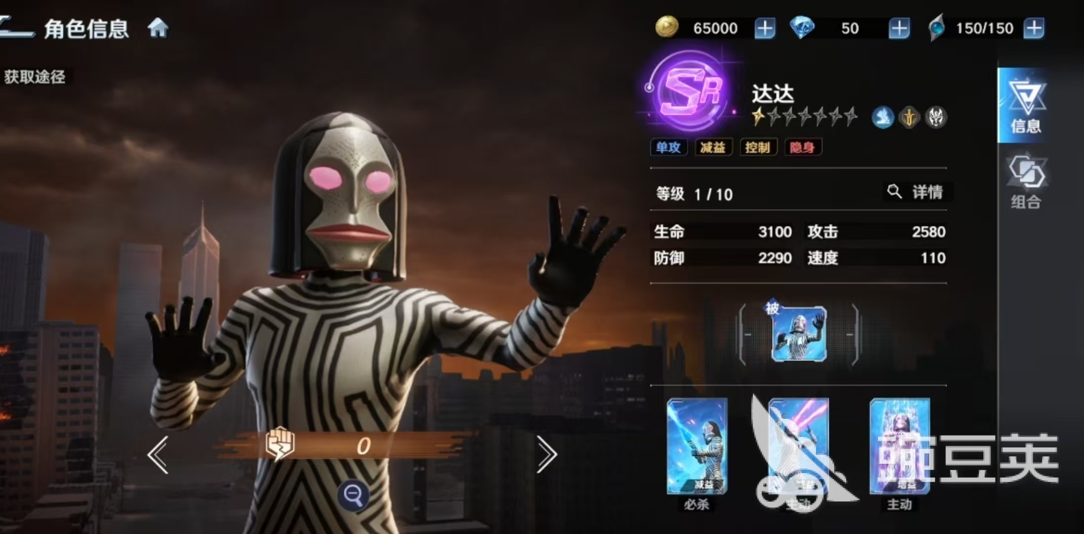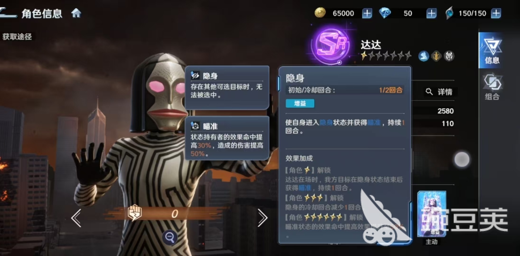 达达的核心输出技能为必杀技“缩小光线”,可对敌方单体造成伤害,并有概率施加持续两回合的“缩小”状态。该状态属于硬控类效果,能显著压制对方主力输出单位的行动能力,在单核阵容对抗场景中尤为关键。随着技能等级提升,基础伤害倍率同步增强。另一主动技能“眼部光线”则提供单体伤害与眩晕控制,星级提升后伤害与触发概率均有所提高,但受限于SR品质,整体眩晕稳定性仍处于中等水平。此外,“隐身”为其核心生存技:发动后进入不可选中状态,同时获得“瞄准”效果;若场上存在其他可攻击目标,则自身不会成为敌方技能或普攻对象,大幅延长站场时间。