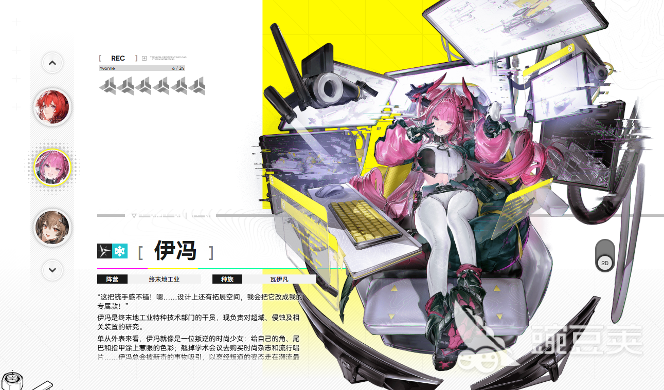 伊冯是《明日方舟》与《终末地》IP联动中登场的瓦伊凡阵营角色,外观以粉白双色为主调,人设融合“居家系”与“技术宅”特质,具备鲜明的视觉辨识度。作为冰属性干员,其核心机制围绕“冻结—破冰—协同输出”三阶段展开,属于典型的控场型冰系附魔角色。