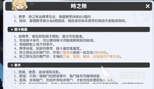 “时之隙”为赛季制独立玩法,每赛季持续两个月,共划分为8个阶段,随赛季开启天数逐步解锁。赛季开启后,所有玩家需从初始关卡重新推进主线,完成各类动态事件以获取奖励。事件类型包括宝箱资源点、野外怪物遭遇战等,内容丰富且具备随机性。需特别注意:赛季结束后,关卡进度将完全重置;同时,所有幻灵等级统一锁定为2100级,确保公平竞技与策略比拼的基础一致性。