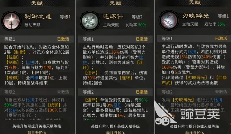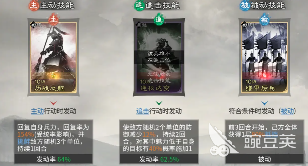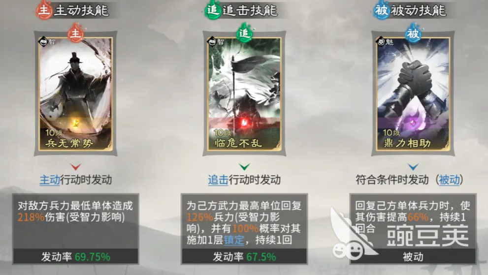 另外在孙权的技能当中,大家要注意给他带的是历战之躯,这个主动技能可以让他挑衅到对面的群体英雄时给自己带来兵力恢复,而另外被动技能就更适合带缮甲历兵,因为可以给我方的武将带来抵挡的状态加成,放在这里使用的话,孙权就可以让我方友军受到对面伤害的时候降低80%的数值,提升整体队伍需要的坦度,庞统放这里,因为他有一定的兵无常势主动技能可以进行搭配,所以对敌人血量目前比较低的敌人进行输出的话,会有一个定点的方式进行提升。