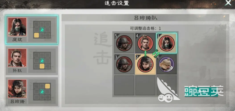 这个阵容当中可以用的角色有孙权、吕玲绮以及庞统,这个阵容在搭配效果上面要注重能否稳定的触发他们的自带天赋,这里兵种跟站位的效果当中一定要注意后排的双穿杨军,在给吕玲绮弥补一部分伤害之后,前期的输出效果上面一定要站孙权的追击,那么在后期庞统的这些格子上面也是可以利用踩追击格子的方位来进行采集的,这样才可以触发更多追击的能力,而庞统站吕玲绮的追击格子就可以了,孙权不踩追击格子,也让其中角色的能力得到最高的追击次数,而在整体队伍当中,孙权自带的天赋当中可以给敌人套上足够的制衡能力,在其中利用这样的状态可以比拼双方的数值,而根据其中互换的武力数值可以让庞统触发连环计的效果,这样敌人知道连环状态的时候,我方就可以给吕玲绮的天赋进行加成,锁定敌方目前武力数值比较高的英雄进行输出,那么就可以攻击敌人输出位置上面的角色了。