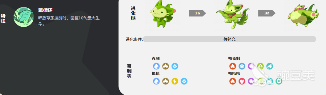 后期在技能时上面他可以学习的是能量刃,通过这个技能它可以造成一定物理伤害之后,自身在每应对成功一次之后,技能威力增加30%,通过这样的方式,他只要应对对面成功的话,他的威力数值还可以带来更多的提升,而当前大家也要注意它作为一个辅助类型的草系精灵,这里还可以选择一个带有恢复能力的技能,比较推荐大家去学的就是应激反应,通过这个技能它可以恢复自身25%的生命数值,然后再应对对面防御的情况下,可以给自己带来的恢复生命会达到80%的数值。