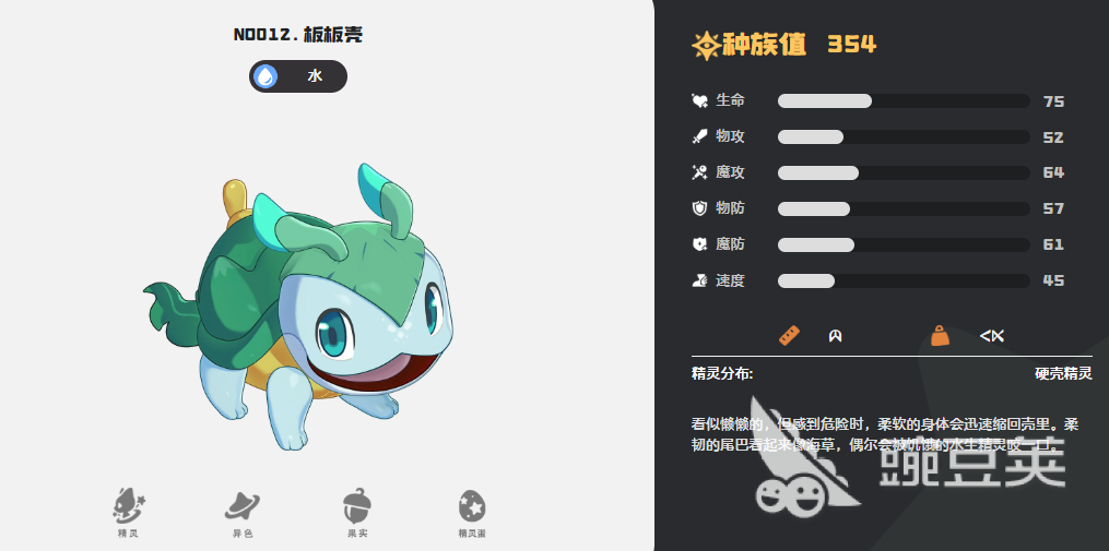 第五个为大家介绍的就是板板壳,它也是一个水属性当中具有独特能力的精灵,但是这个精灵看起来是非常像放慢版的乌龟,而且它的各种动作当中,其实后期带来的能力都是走防御路线的,因为自身特性效果带来的技能是利用这个能力,它可以让防御数值上面2点,所以放在后期,如果要为板板壳进行组配阵容的话,就要利用这个优势来进行组合,防御技能越好用的同时,板板壳利用这个减少能耗的情况也可以用到更多的防御数据,后期还可以给队友带来保护。