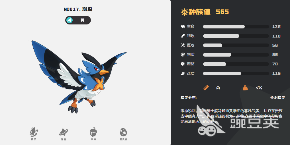 第六个为大家推荐的精灵是岚鸟,岚鸟作为一个翼属性的精灵,其实在当前是适合空中动作的,对空输出的能力也是比其他的输出效果更好用,所以在各种高空效果上面带来的飞行能力也比较强,利用顺风这个技能,它可以带来先手输出的效果,而且在压制住敌方进行攻击的情况下,它可以带来的威力提升也是50%,所以如果大家想要用一些空中精灵进行输出压制,那么可以选择的就是这个岚鸟。