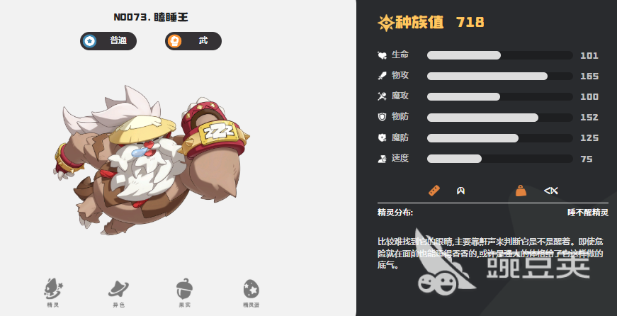 第二个为大家推荐的是瞌睡王,瞌睡王也是属于双系精灵,当前是普通以及武系的几率,利用瞌睡王的效果,大家就要注意它在环境的适应能力上面是非常高的,利用天赋慢热型的效果,他只要在登场之前其他的精灵有过行动的话,那么此时就可以给他自身带来一定的能量累积,所以在此时一定要注意给瞌睡王进行配对的话,他一定不要放在第一个位置,如果放在第一个位置的话,这个天赋一般是触发不成功的,所以在后续前面的精灵有过成功触发,然后在此时瞌睡王就可以得到5点能量积累,此时它的初始能量数值就可以快速的提升起来,就算一进入场内的能量是0的话,大家也不用担心后期没有能量可以释放其他技能。