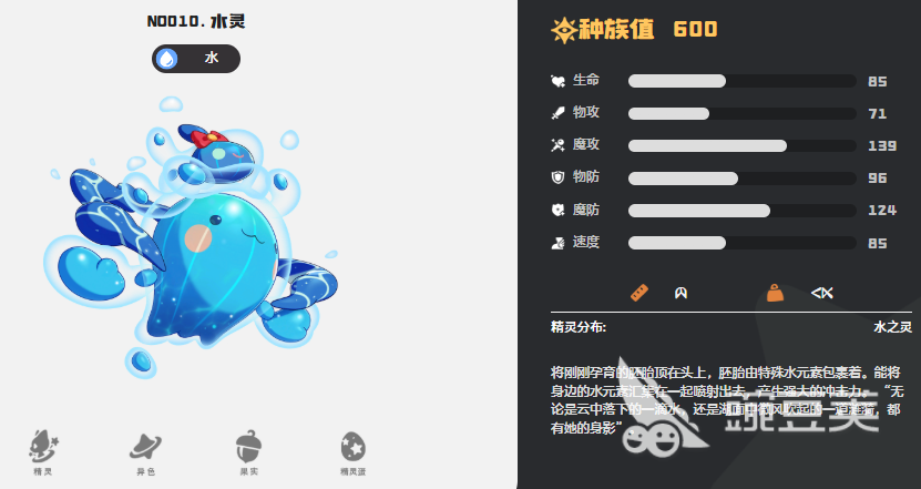 第五个为大家推荐水系精灵当中基础的水灵,水灵作为前期新手玩家很有可能会选择的一个核心宠物,它自身的技能效果是可以快速将周围的水元素吸收起来,然后喷射出去,带来的强大冲击能力是非常不错的,而且使用手感是非常简单的,后期利用他的天赋浸润,可以让水灵在使用自身带来的水系技能时,让所有技能在消耗量上面都减少一点,所以通过这样的方式可以让他在能量积累上面快速积累起来更多的数值,使用各种技能的时候,能量消耗少了,之后它带来的连招也会更多一些。