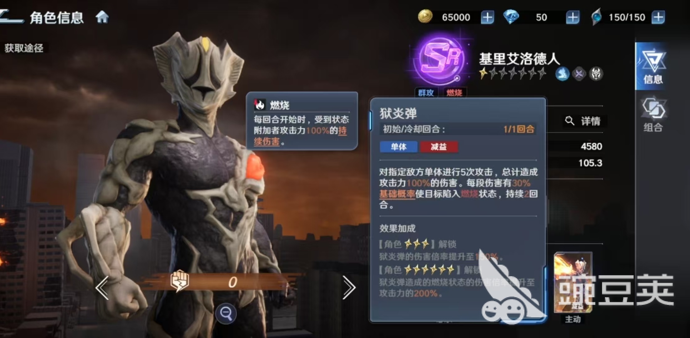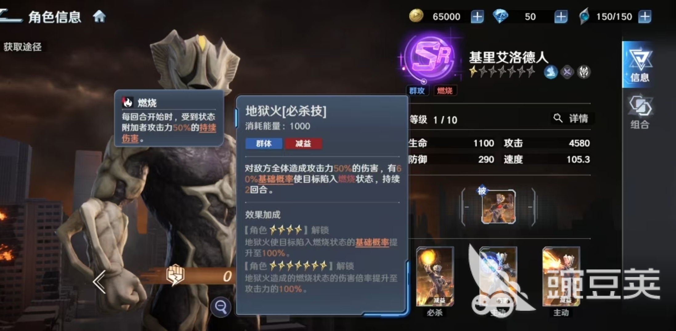 基里艾洛德人的核心机制围绕“燃烧”异常状态构建。其被动技能在战斗初始即提升自身效果命中率20%,显著强化燃烧施加稳定性。必杀技“地狱火”可对敌方全体造成伤害,并附带燃烧状态,持续2回合;当角色升至满星后,该技能触发燃烧的基础概率提升至100%,同时伤害倍率同步提升至100%。被施加燃烧的目标,每回合开始时将额外承受相当于施放者50%攻击力的持续伤害。虽单体爆发有限,但群体覆盖率高,配合多目标燃烧可形成可观的持续输出压制。