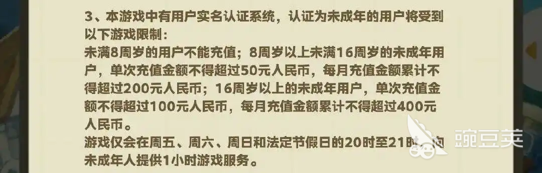 8岁到16岁这个年龄段的未成年玩家每一次的充值金额都不能超过50元人民币,每个月的充值金额更是有着硬性的限制,每个月绝对不允许超过200元人民币,至于年龄已经满16岁的未成年则是对单次充值金额和累积充值金额有着限制,单次不得超过100,累积充值金额不能够超过400元,最重要的是游戏还对未成年玩游戏的时间进行了限制,未成年玩星布谷地时,只能在每周五、六日这三天以及法定的节假日中有1个小时的游戏时间,且游戏时间规定在了20点到21点。