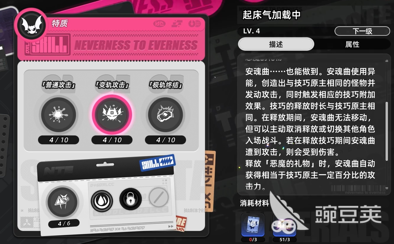 普通情况下,安魂曲在释放技能时可丢出异能造物来对敌方造成伤害,同时进行噩梦效果的叠加,但安魂曲也可在释放技能时创造出与学习目标相同的怪物,并发动与学习目标一样的攻击招式,这也是安魂曲独特的变身机制,可在需要时变身成怪物来帮助自己打输出,亦或是去利用怪物的攻击机制,来为自己后续的攻击提供助力,实战中运用得好能搭配出十分奇妙的效果。当玩家们主动解除或是切换其他角色入场后,都可让安魂曲退出变身。