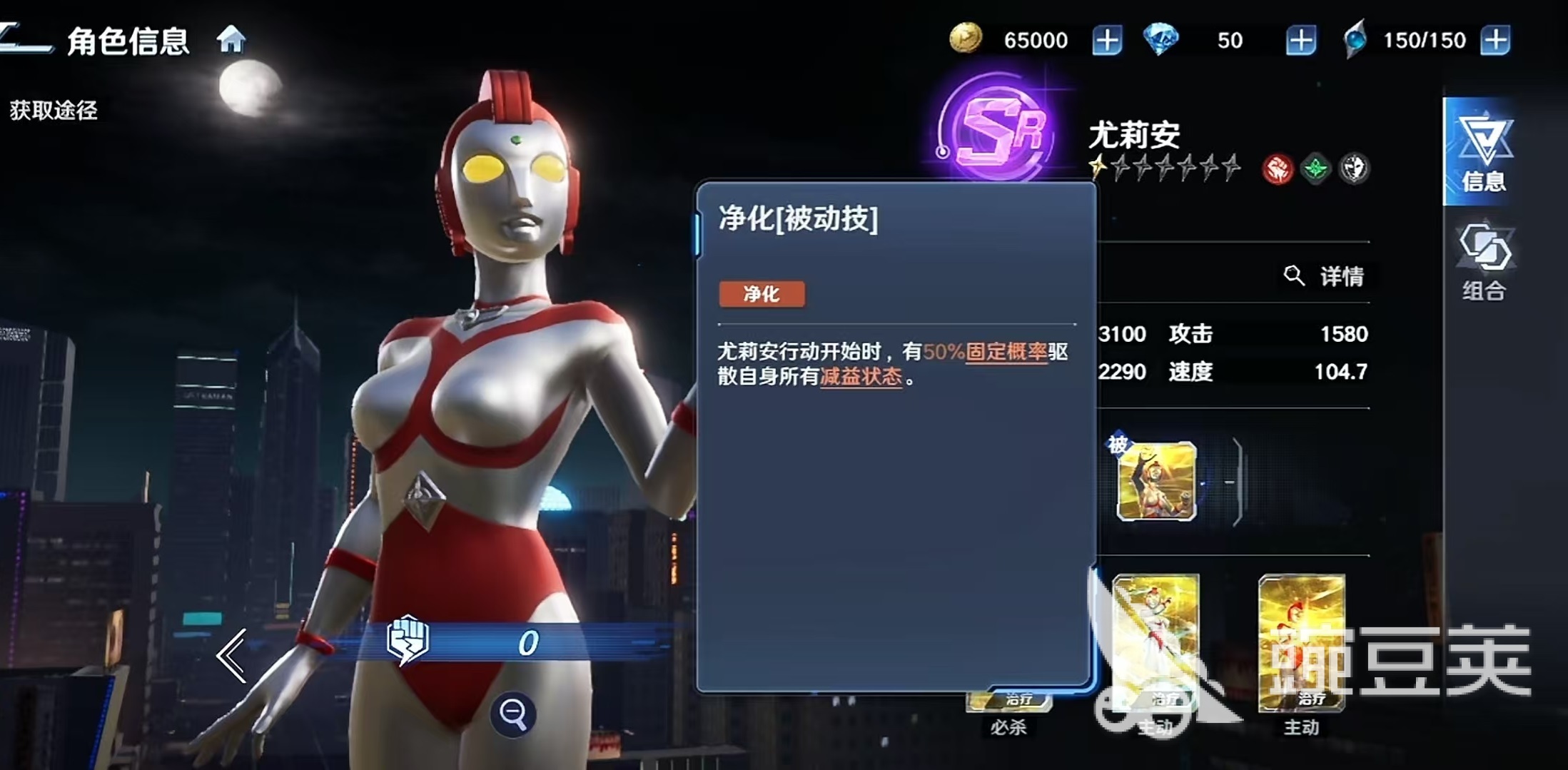 尤莉安作为游戏中SR稀有度角色,具备极强的战术延展性。其被动技能“净化”可在每次行动开始时,以50%概率清除自身全部减益状态,有效规避控制链与持续伤害压制,保障技能释放节奏稳定,是前期开荒阶段少有的高容错辅助人选。