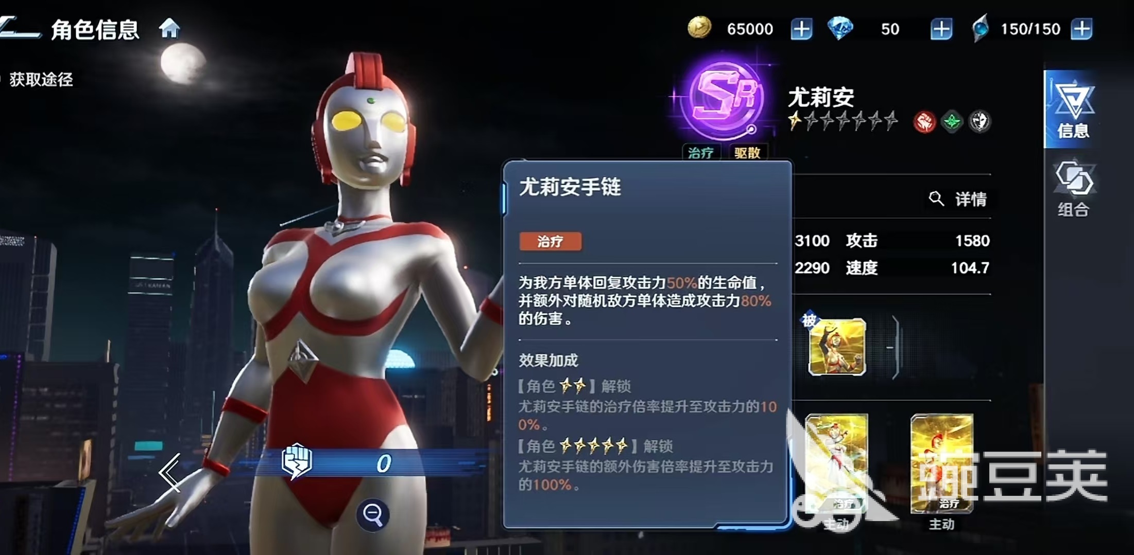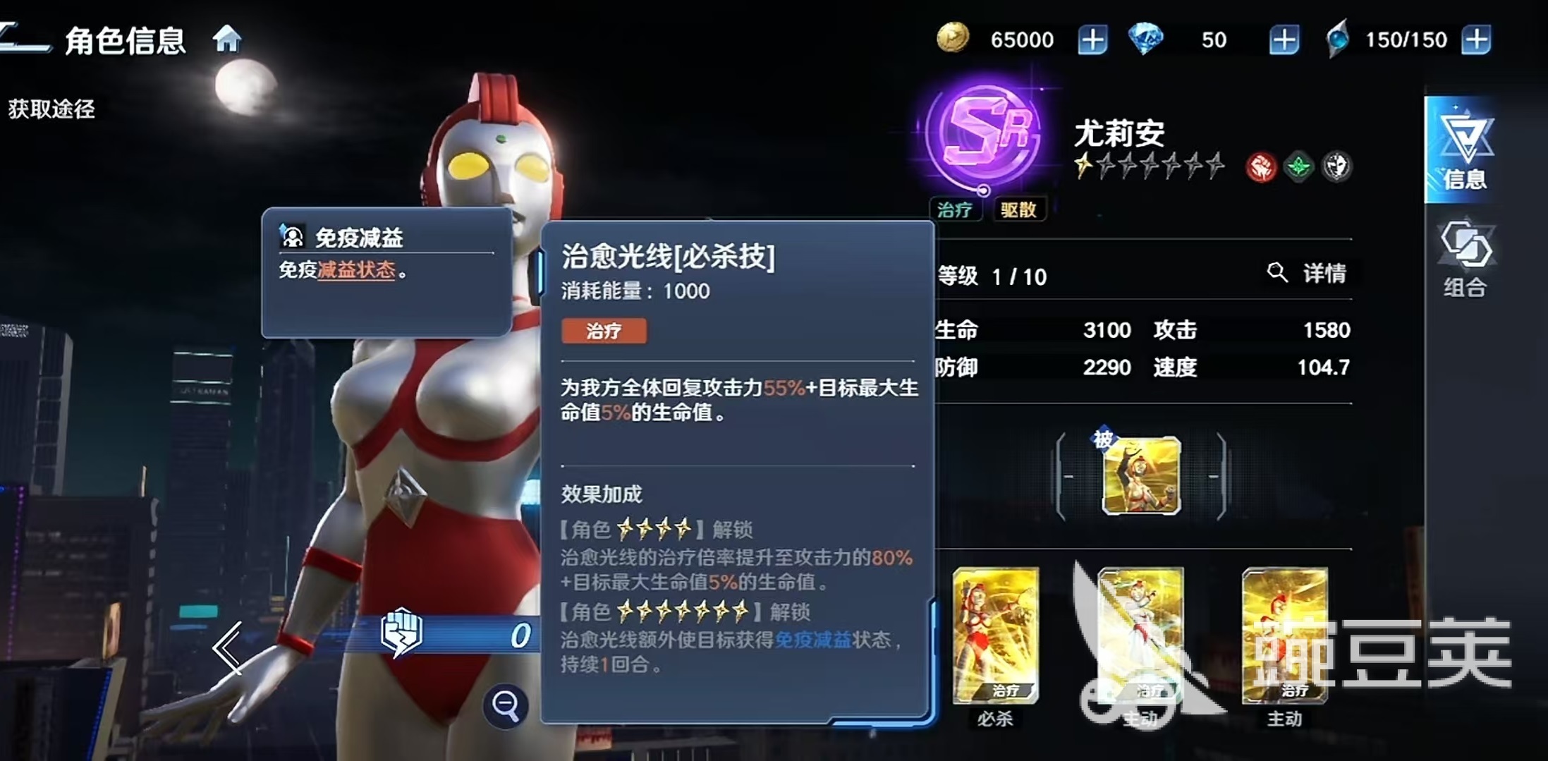 尤莉安的核心输出与支援能力集中于三大技能:必杀技“治愈光线”可对全体友方单位进行生命恢复,治疗量同时受尤莉安攻击力与目标最大生命值影响;随星级提升,最高可额外获得80%攻击力加成及5%最大生命值比例治疗效果,并赋予目标“免疫减益状态”效果,大幅削弱敌方异常状态压制体系。两个主动技能分别覆盖单体精准治疗+随机敌方伤害,以及群体治疗+每名友方驱散1个减益状态,形成多维生存保障。