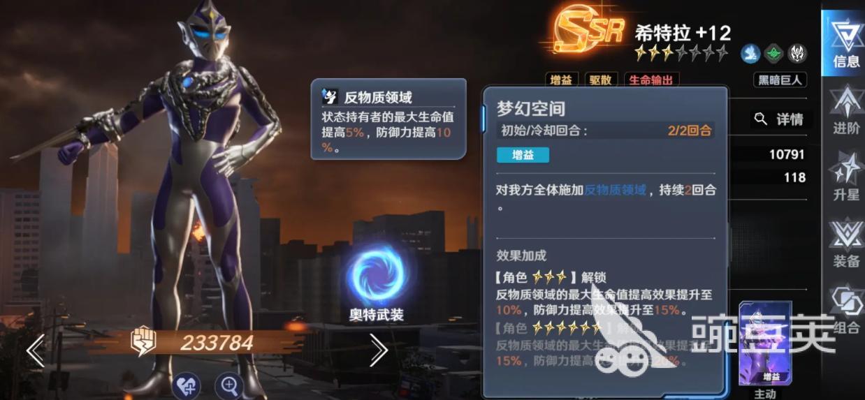 普通赛罗——紫阶角色中综合强度最突出的存在。群体伤害倍率达300%,且具备“击杀后无限追击”机制,实际战斗中常实现伪群攻效果;当目标携带减益状态时,单体技能倍率提升至510%,兼顾清杂与精准打击。培养周期短、成本可控,是平民与微氪玩家首选的核心输出位。