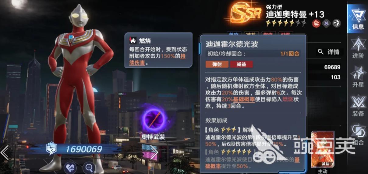 强力迪迦——燃烧流体系核心。小技能可对全体敌人施加灼烧效果,该DOT本身即具备150%群体倍率;大招专注单体爆发,确保在持续战与限时挑战中输出稳定可靠,为燃烧队提供不可替代的伤害基底。