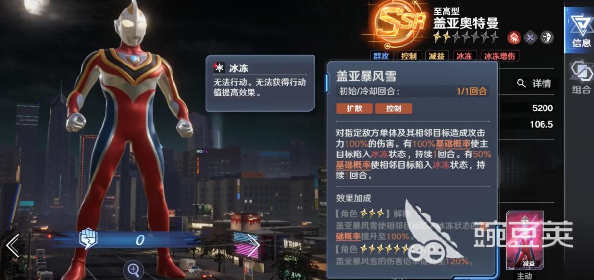 闪耀赛罗奥特曼——当前版本唯一无明显短板的顶级输出。群体技能基础倍率为250%,在理想增益环境下单体爆发可稳定达到600%。兼具AOE压场与单点斩杀能力,适用于所有高难度内容。但受限于极高的获取门槛与培养消耗,属于高投入高回报型角色,更适合资源充裕的玩家重点构建。
