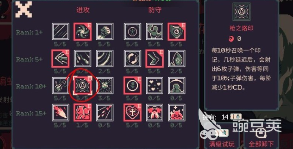 接下来就是符文跟武器的选择搭配,建议玩家在选择符文的时候,只留枪之烙印,剩下的玩家直接把点燃,冰冻这些子弹特效尽可能的提高,而对于枪支烙印的效果其实比较适配。不开枪的玩法,通常情况下,每10秒钟就能够召唤一个印记,一旦延迟之后,会自动射出6枚子弹。当然它的等级越高,所形成的冷却也就会越短。