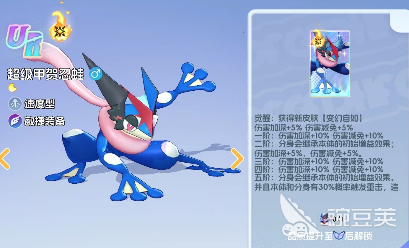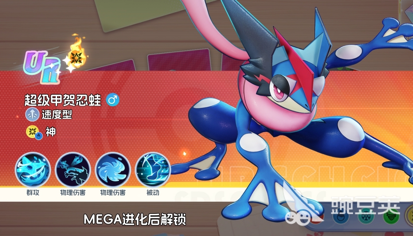 与其他的UR宝可梦一样,超级甲贺忍蛙在完成MEGA进化后,同样会多出一个觉醒技能,其形态也会发生改变。觉醒技除了能为超级甲贺忍蛙提供增伤和伤害减免外,还能令它在释放影分身后,令影分身继承本体初始的增益效果,强化影分身的输出能力。如果能将MEGA进化突破到五阶,本体和分身在进行攻击时还有概率触发伤害倍率为200%攻击力的重击效果,并附带2秒的眩晕,当本体释放终结技时,分身也会跟着一起释放,即便此终结技伤害只有本体的30%,但也能极大地提升超级甲贺忍蛙的输出能力。