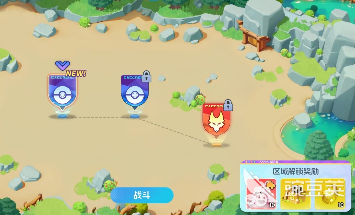 岛屿中的每个地块在初始阶段处于不可开发的阶段,玩家们需按顺序进行区域解锁,才能逐步扩大自己可用的岛屿面积。每个区域在解锁时不光需要玩家们在探险玩法里通关对应的关卡,还需要完成三次解锁战斗,这三次战斗无需一次性打完,若玩家觉得对手难度太高,可在提升宝可梦练度后再来挑战,之前打过的关卡不会重置。完成挑战后,该区域便会变成空地,同时下一区域将会立刻便为可解锁的状态。