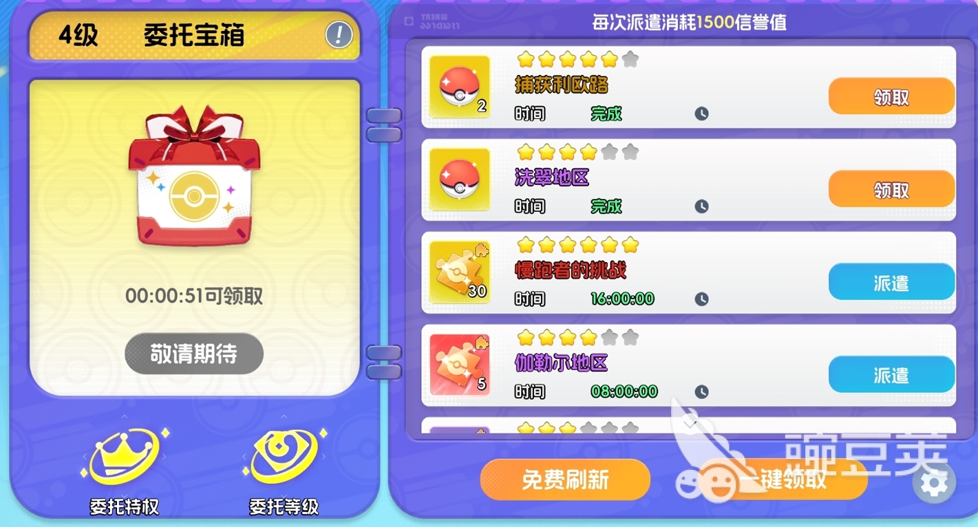这些派遣任务完成起来也很简单,人们接取想要完成的任务后,只需选择合适的宝可梦,便可派遣它去执行任务,等时间到后就能领取任务的奖励。每次派遣都需要消耗1500的信誉值,信誉值不足时无法接取任何派遣任务,玩家们可通过多种方法来进行信誉值的获取,无论是推图还是领取挂机资源都能拿到,产出途径很多且产量非常大,所以不用担心出现信誉值不足的问题。