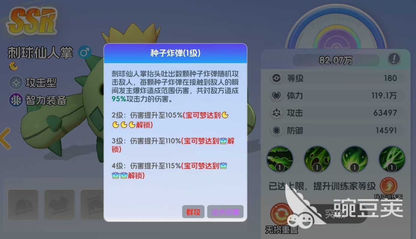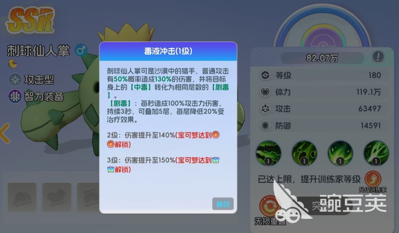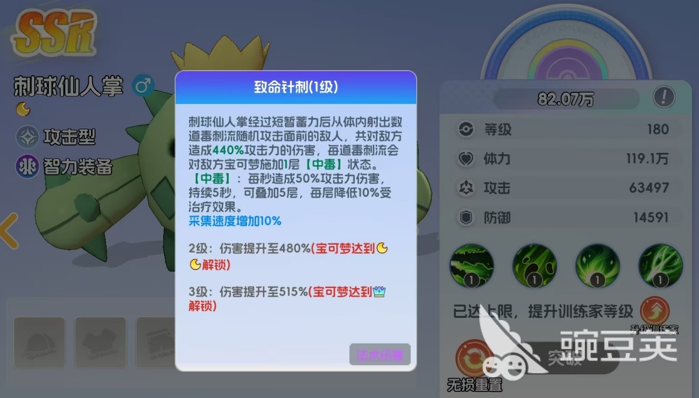 总的来说刺球仙人掌是实用性很高的SSR宝可梦,其对敌人施加的中毒效果和剧毒效果会极大减弱敌人的持续作战能力,且自身的伤害也并不低。宠物集结刺球仙人掌好用么已经为各位分享完,希望本篇攻略能帮各位更好地了解这只宝可梦。