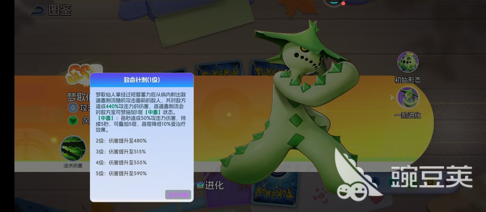 在完成一阶进化之后,就会变成梦歌仙人掌。作为风属性攻击型的宝可梦,核心的战术是围绕持续性伤害,还有中毒的效果。致命针刺技能实用性很出色,梦歌仙人掌在短暂蓄力之后,就会从体内射出无数道毒刺流,随即就会攻击面前的敌人,并且针对敌人造成590%的攻击力伤害。每道毒刺流针对敌方宝可梦都会有中毒的状态,中毒状态每秒就会造成50%的攻击力。