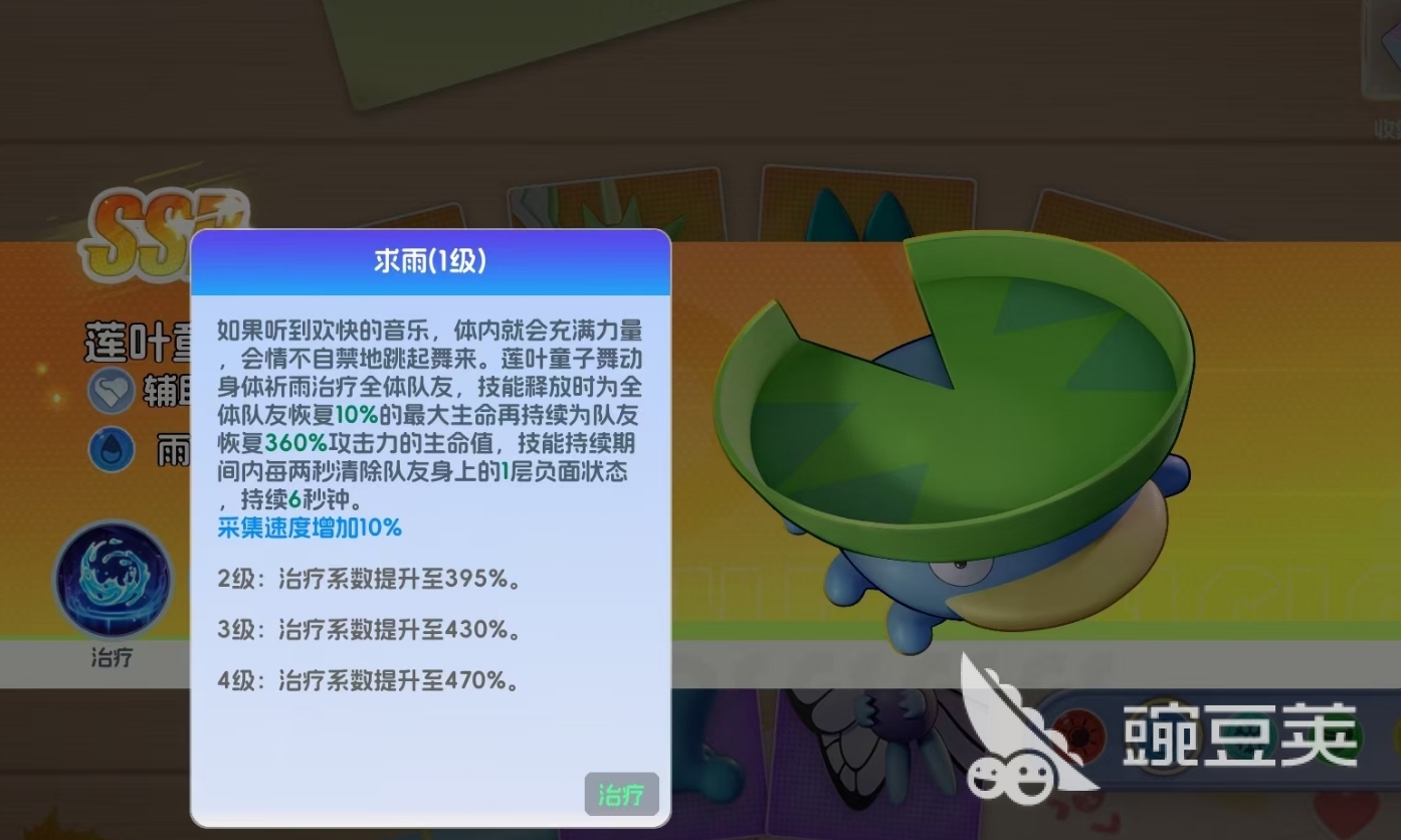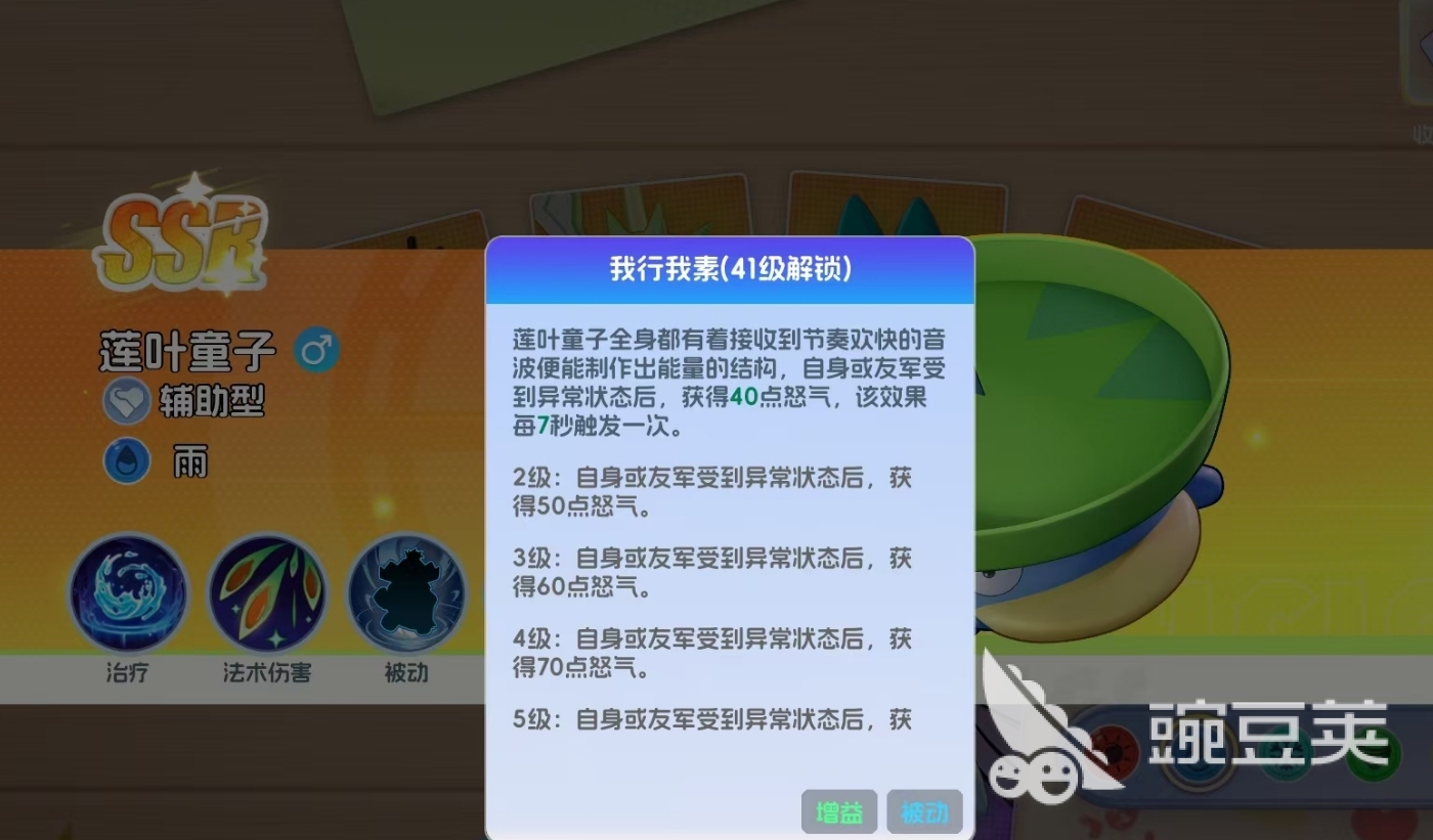 回怒也是莲叶童子的特性之一,只要它的等级达到了41级,便能解锁被动我行我素,只要自己或队友受到了异常状态,就能立刻令自己回复怒气。虽然说该效果有七秒的冷却,但依然能让莲叶童子释放出更多的大招,从而为队友解除负面,等该技能等级高后,很容易就会出现其他宝可梦只释放了一次大招,莲叶童子却已经完成两次大招释放的情况,这也令莲叶童子在等级高时会拥有更多的出战空间,成为玩家在面对一些负面效果多的阵容时必上的宝可梦。至于莲叶童子最后一个技能,则是能为它提供更多的血量和防御数值,让它的生存能力得到强化。