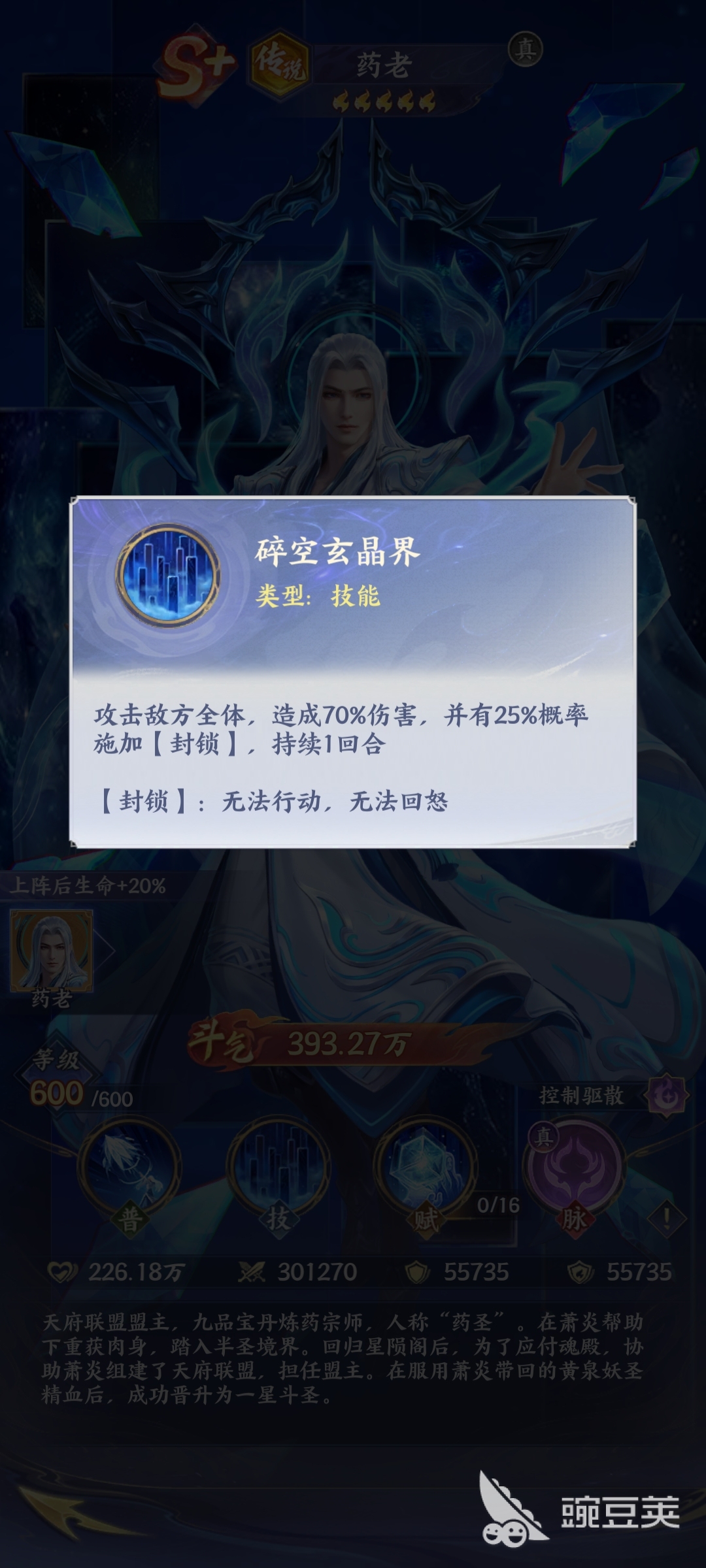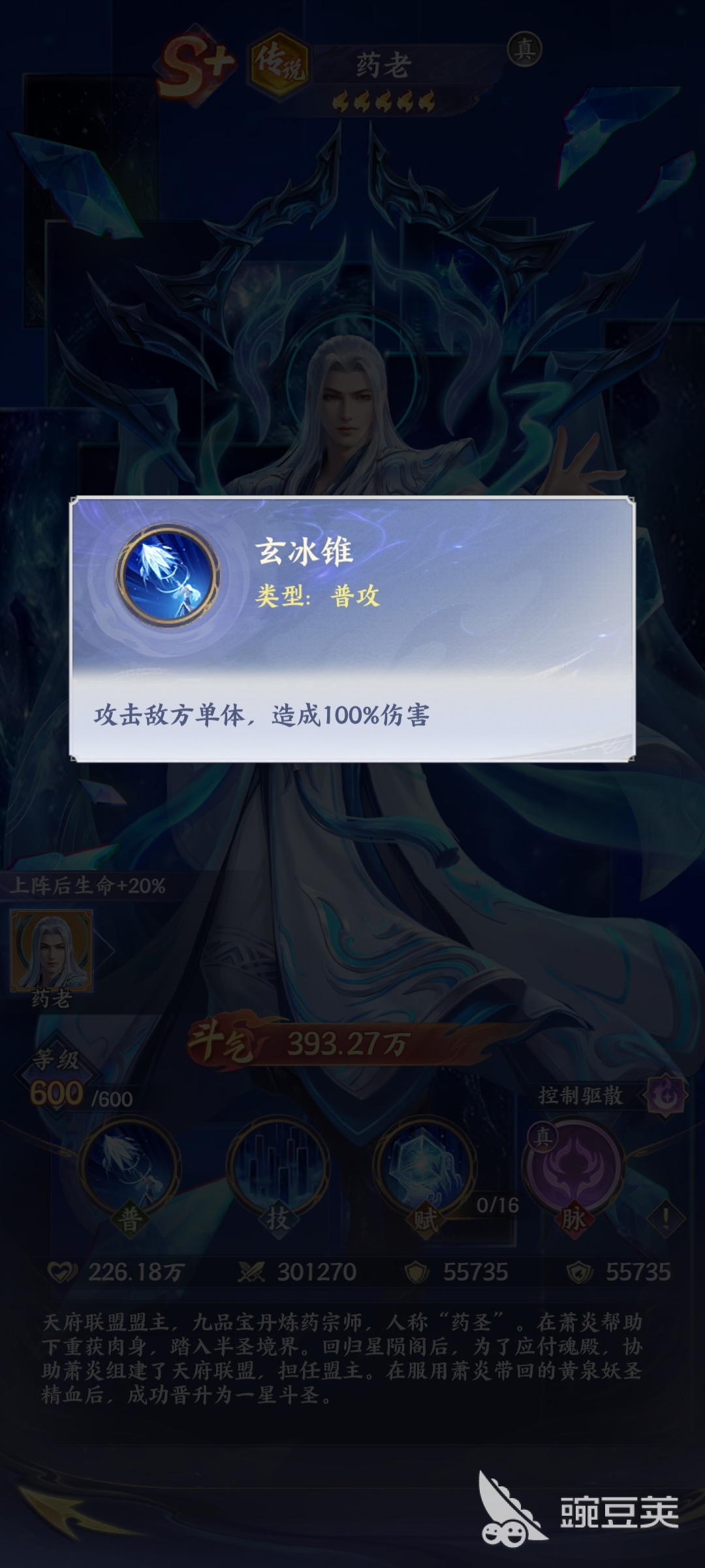 玩家如果想要知道药老的玩法,其实就需要知道药老的技能特点。药老既然是传说类型的斗者,他其实实力是比较强悍的,主要是控制的作用。简单来说就是在战斗的过程当中能够起到控场的效果,并且还能够达到增益的作用。所以说玩家在合理运用药老的时候,一旦施展普通攻击技能玄冰锥。虽然是基础攻击,但是能够对敌人造成高额的伤害,他也是稳定输出的辅助。